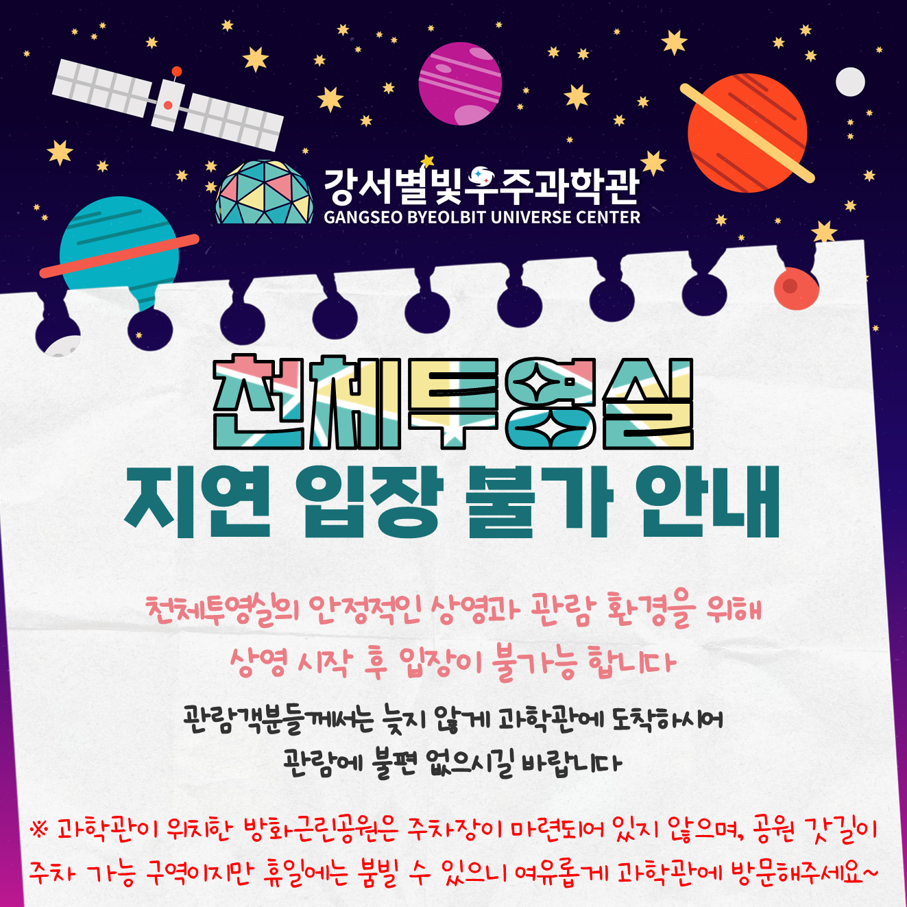 주소 : (07508) 서울특별시 강서구 금낭화로 178(방화근린공원 내) 강서별빛우주과학관